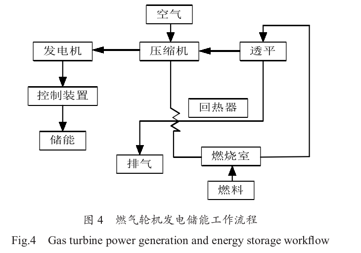 燃氣輪機發(fā)電儲能是通過燃料供給系統(tǒng)將天然氣輸送到燃燒室。天然氣在燃燒室內與空氣混合燃燒,產生高溫高壓的燃氣。這些高溫高壓的燃氣迅速膨脹,并流經透平葉片, 推動透平旋轉。透平葉片通過軸連接到發(fā)電機,透平的旋轉帶動發(fā)電機的轉子旋轉,從而在定子中產生電流,完成電能的轉換。最終將電能儲存到儲能系統(tǒng)中,以便在電力需求高峰期或電網出現(xiàn)故障時進行釋放和使用。如圖4所示。在燃氣輪機發(fā)電儲能過程中,儲能系統(tǒng)可以幫助平衡燃氣輪機發(fā)電的輸出波動。燃氣輪機的啟動和停止時間較長,且燃料燃燒效率和發(fā)電效率容易受環(huán)境溫度和負荷變化的影響。通過儲能系統(tǒng)的調節(jié),可以在短時間內補償輸出功率的波動,確保電網的穩(wěn)定運行。在負荷較低時,燃氣輪機的效率較低, 部分燃料會被浪費。儲能系統(tǒng)可以在這種情況下存儲多余的電能,并在電力需求高峰期釋放,減少燃氣輪機的啟動和停止次數,從而提高整體的能源利用效率。