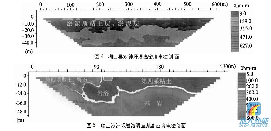 (3)高密度電法劃分地層 2000年4月初,在建中的湖口縣雙鐘圩堤部分堤段滑塌。事故發生后我院在該堤段進行了綜合物探勘察,為分析滑塌地質原因提供了基礎地質資料。雙鐘圩堤壩體填土層約7m,其下部為淤泥質粘土層與淤泥層,淤泥層下部為泥盆系五通組砂巖。