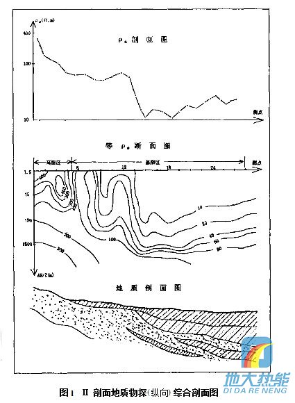 圖1 Ⅱ剖面地質物探(縱向)綜合剖面圖 物探電測深成果和鉆井資料表明,本區第三系中有三個含水段,分別在距地表50~70m、100~140m、170~200m處,每段有1~4個含水層,單層厚度2~26m。富水程度較好,在11眼成井中,單井單位涌水量最大可達60t/h。