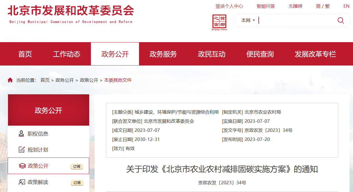 7月18日,北京市農業農村局關于印發《北京市農業農村減排固碳實施方案》的通知。