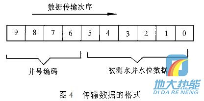 現(xiàn)在通過單片機輸出控制一組由三極管組成的電子開關(guān),由電子開關(guān)代替按鍵功能完成數(shù)據(jù)輸入.例如:要傳輸十進(jìn)制數(shù)據(jù)0,1,2,3,4,5,6,7,8,9,單片機依次輸出接通雙音頻編碼器輸入數(shù)字按鍵0,1,2,3,4,5,6,7,8,9對圖4 傳輸數(shù)據(jù)的格式應(yīng)的電子開關(guān)的控制信號,則該組數(shù)據(jù)經(jīng)雙音多頻編碼器轉(zhuǎn)換為雙音頻信號. 雙音多頻編碼器在單片機控制下,定時“撥通”水位監(jiān)測中心電話號碼,在水位監(jiān)測中心計算機應(yīng)答并“摘機”的情況下,通過這條已接通的電話線路,將所測的水位數(shù)據(jù),經(jīng) 過雙音多頻編碼器編碼后傳送到監(jiān)控中心. 要傳輸?shù)臄?shù)據(jù)格式為:數(shù)據(jù)長度為10位十進(jìn)制數(shù),其中高四位為井號編碼,低六位為所測量的水井水位數(shù)據(jù),水位數(shù)據(jù)分整數(shù)和小數(shù)兩部分.數(shù)據(jù)傳輸?shù)姆较蚴菑母呶坏降孜?數(shù)據(jù)格式如圖4所示.