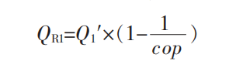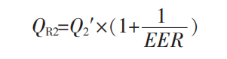 式中:QR1 為巖土體提供熱量;Q1′為建筑空調(diào)總熱負(fù)荷, 2963 kW;cop 為熱泵機(jī)組制熱性能系數(shù),5.0。由式(1)得QR1=2370.4 kW, 即巖土體吸熱量2370.4 kW,滿足建筑供暖需求。巖土體制冷量計(jì)算見(jiàn)式(2)。